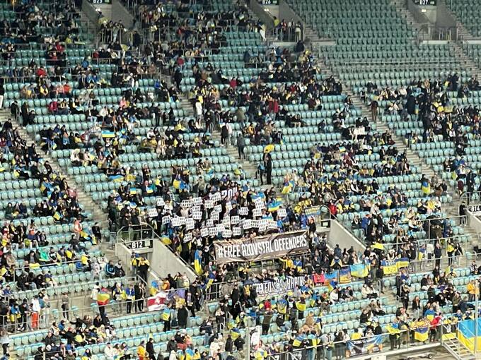 Болельщики сборной Украины перед началом поединка развернули баннер Free Azovstal Defenders (Освободите Защитников Азовстали).