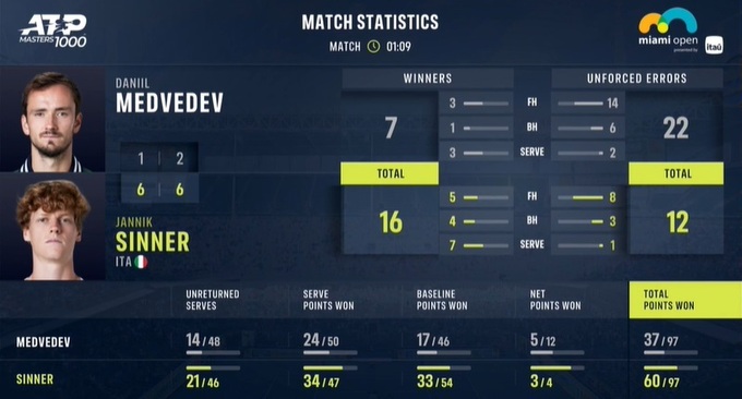 Это был 11-й матч теннисистов, на счету Медведева шесть побед, но Синнер выиграл последние 5 встреч.
