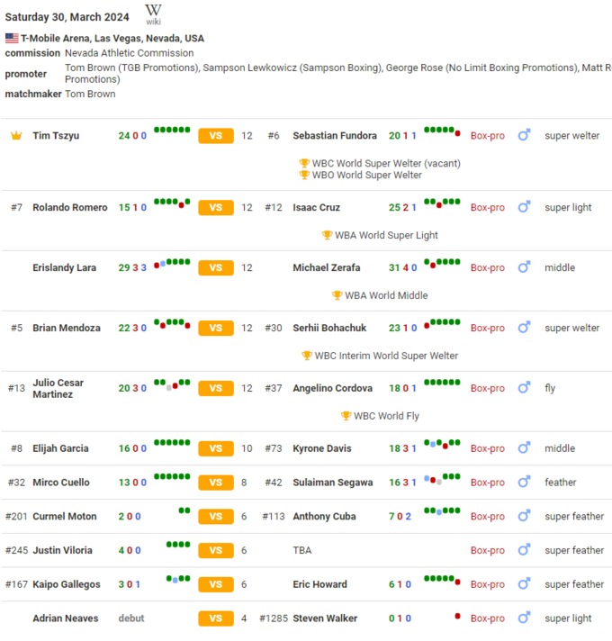 В главном поединке встретятся австралиец Тим Цзю (24–0, 17 KO) и Себастьян Фундора из США (20–1–1). На кону стоят чемпионские пояса по версиям WBC и WBO в первом среднем весе.