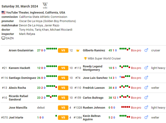 в главном событии Арсен Гуламирян из Франции (27–0, 18 KO) встретится с мексиканцем Хильберто Рамиресом (45–1, 30 KO).