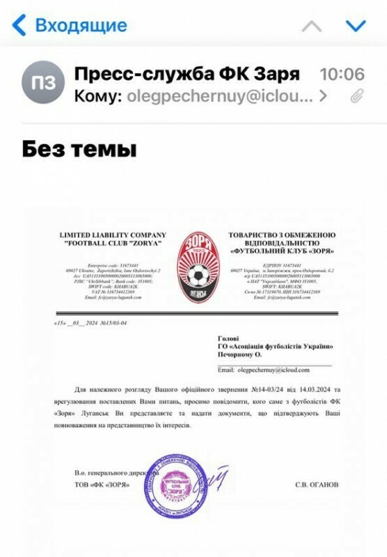 Относительно ответа «Зари», то нам его подписал Станислав Оганов, который отсутствует в структуре клуба. Еще в октябре 2022 года была информация, что он подал в отставку с поста генерального директора. Пока начальником в команде является Игорь Гузь. То есть, этот ответ – очередная афера луганчан.