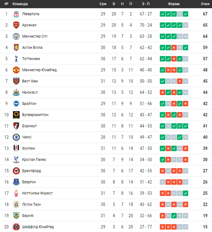 🏆 Турнирная таблица АПЛ