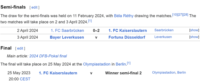 В финале соревнований «Кайзерслаутерн», который выступает во Второй Бундеслиге, сыграет либо против «Байера», либо против «Фортуны» Дюссельдорф.