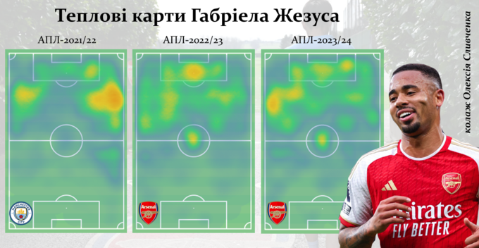 Пока тенденция, что Жезус в «Арсенале» пришел к тому, от чего уходил в «Манчестер Сити», прослеживается даже по тепловым картам бразильца за последние три сезона в АПЛ. Если в минувшем чемпионате Англии бразилец чаще всего оказывался именно на позициях, присущих центральному нападающему, то сейчас он гораздо чаще обитает на левом фланге – там, где приносит пользу команде, но не способен забивать по нескольку десятку мячей за сезон.