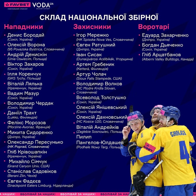 Нападающие: Александр Пересунько (HK Poprad, Словакия), Илья Коренчук (GKS Tychy, Польша), Даниил Трахт (Lukko, Финляндия), Андрей Денискин (Unia Oswiecim, Польша), Виталий Лялька, Глеб Кривошапкин (оба – Кременчуг, Украина) Денис Бородай, Вадим Мазур, Виктор Захаров, Владимир Чердак (все – Сокол, Украина), Алексей Ворона (HK 95 Povazska Bystrica, Словакия), Михаил Симчук (Grand Canyon Univ, США), Станислав Садовиков (Berani Zlin, Чехия), Евгений Фадеев (Snackpoint Eaters Limburg, Нидерланды), Никита Сидоренко (Днепр, Украина), Феликс Морозов (Morzine-Avoriaz, Франция).