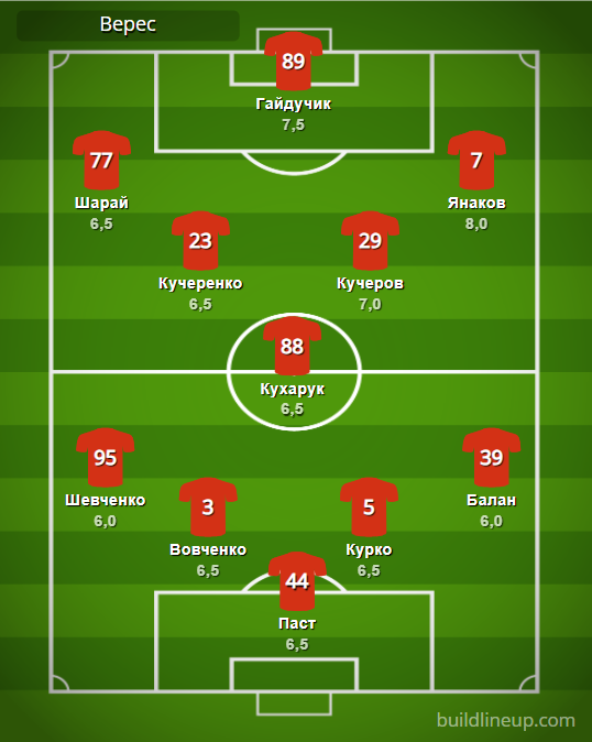 «Верес»: Паст (Когут, 83) – Шевченко, Вовченко, Курко, Балан – Кучеренко, Кухарук, Кучеров (Яго, 70) – Шарай (Шастал, 57), Гайдучик (Морозко, 70), Янаков (Дахновский, 58).