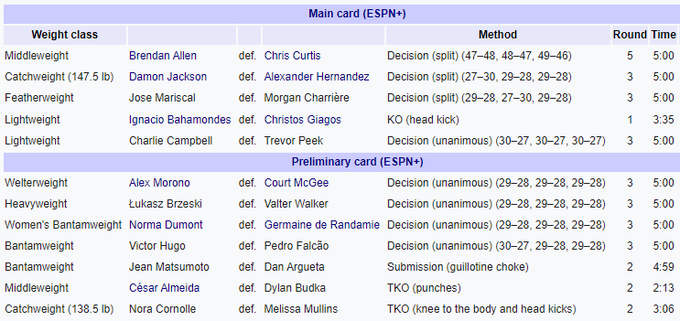 В главном бою встретились Брендан Аллен (США, 23–5) и Крис Кертис (США, 31–10, 1 NC)