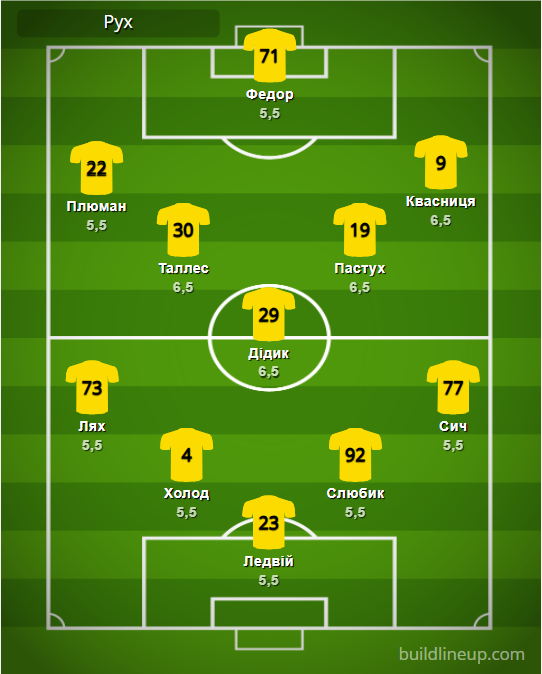 «Рух»: Ледвий – Лях (Притула, 60), Холод, Слюбик, Сыч – Таллес (Теслюк, 85), Дидык, Пастух – Плюман (Джурабаев, 85), Федор (Клайвер, 85), Квасница (Рунич, 70).