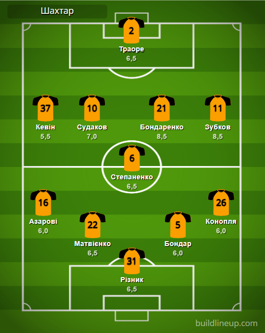 «Шахтер»: Ризнык – Азаров, Матвиенко, Бондарь, Конопля – Степаненко (Назарина, 87) – Кевин (Эгиналду, 46, Швед, 58), Судаков, Бондаренко (Марлон, 77), Зубков – Траоре (Сикан, 57).