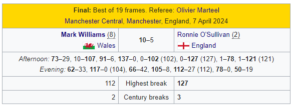 Если не считать титулов в турнирах Тройной Короны, это явно один из самых значительных триумфов Марка Уильямса, поскольку на этой неделе в Манчестере он обыграл трех лучших игроков мира – Джадд Трамп был отправлен домой со счетом 4:10 в четвертьфинале, Марк Аллен получил 5:10 в полуфинале, а теперь пришла очередь знаменитого О'Салливана в финале. В возрасте 49 лет Уильямс показал лучший снукер, который он демонстрировал со времени своей третьей короны ЧМ в Крусибле в 2018 году.