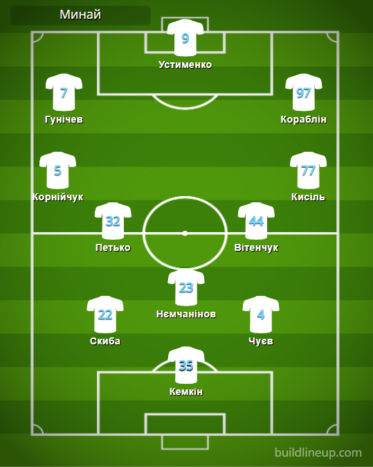 «Минай»: Кемкин – Скиба, Немчанинов, Чуев (Поддубный, 51) – Корнийчук (Ременяк, 46), Петько (Семотюк, 67), Витенчук, Кисель (Дмитрук, 80) – Гуничев (Вакула, 46), Устименко, Кораблин.