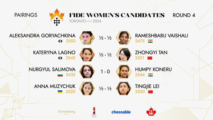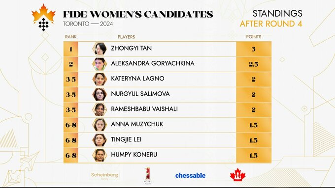 Китаянка Тань Чжунъи возглавляет таблицу после 4-го тура, имея 3 очка из 4. Анна Музычук делит 6–8 места (по 1,5 очка из 4).