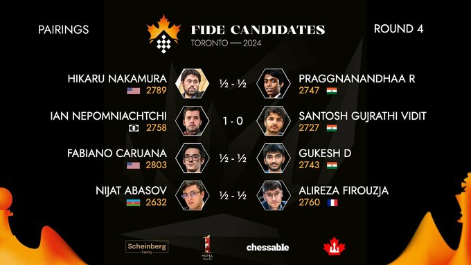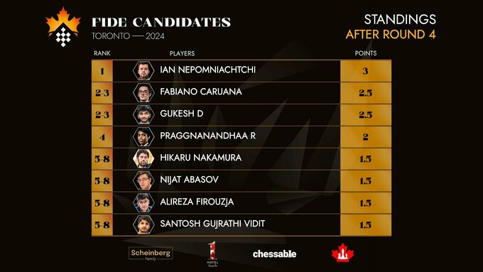 В мужском турнире, выиграв у индийского шахматиста Видита Гуджрати, единоличным лидером стал Ян Непомнящий (FIDE), у которого 3 очка из 4. Далее идут Фабиано Каруана (США) и Гукеш Доммараджу (Индия) – по 2,5 очка из 4.
