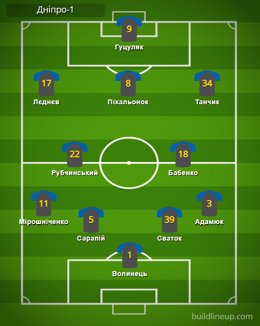 «Днепр-1»: Волынец – Мирошниченко, Сарапий (Пасич, 74), Сваток, Адамюк – Рубчинский, Бабенко – Леднев (Третьяков, 74), Пихаленок (Очеретько, 6), Танчик (Горбунов, 63) – Гуцуляк.