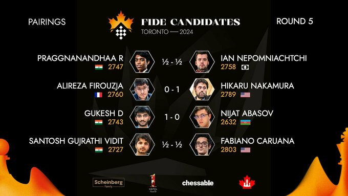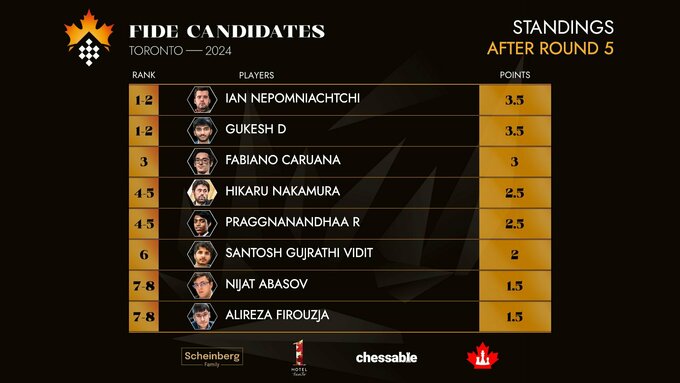 В мужском турнире два лидера – к Яну Непомнящему (FIDE) присоединился индийский шахматист Гукеш Доммараджу. У них по 3,5 очка из 5. Далее идет Фабиано Каруана (США) – 3 очка.