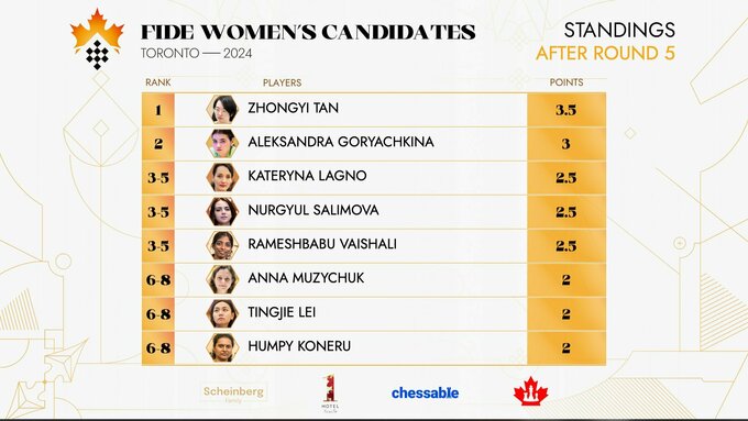 Китаянка Тань Чжунъи возглавляет таблицу после 5-го тура, имея 3,5 очка из 5. Анна Музычук делит 6–8 места (по 2 очка из 5).