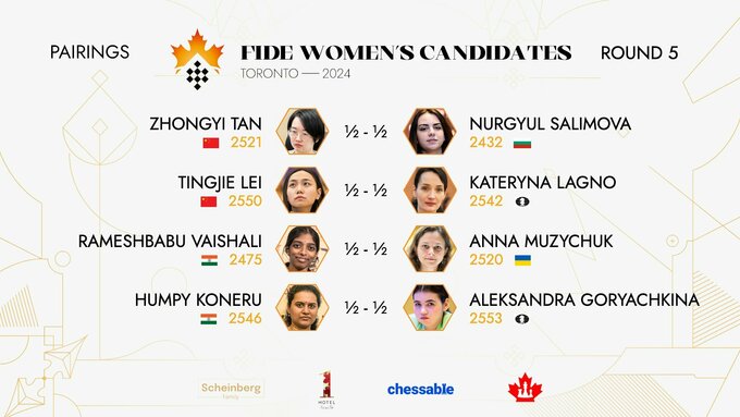В женском турнире все партии 5-го тура завершились вничью. Украинка Анна Музычук сыграла вничью черными фигурами с Рамешбабу Вайшали (Индия).
