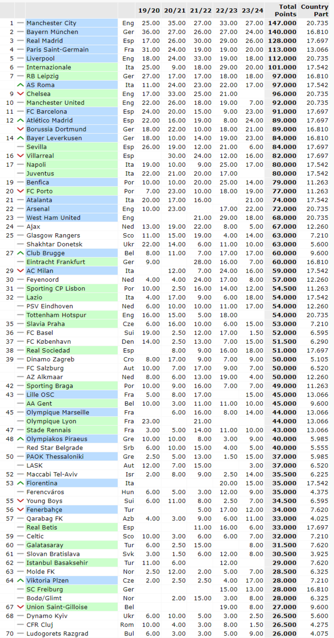 Среди грандов: уверенно лидирует Англия (103.678), а между Испанией (88.489) и Италией (87.712) продолжается сражение за второе место рейтинга.
