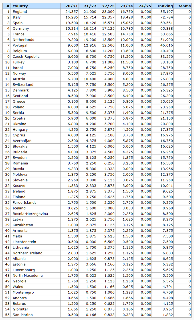 Чтобы вернуть 5 команд в еврокубках для сезона 2026/27, надо будет входить в топ-15 по итогам рейтинга 2025. То есть, сине-желтым нужно прыгнуть на 6 позиций вперед. С учетом отставания в 5.5 баллов от Дании, идущей 15-й (26.325), это будет сделать крайне сложно.