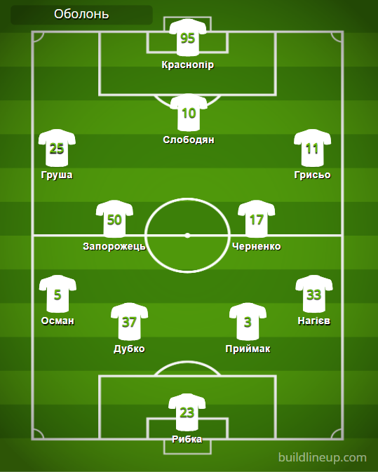 «Оболонь»: Рыбка – Осман, Дубко, Приймак, Нагиев – Груша (Суханов, 74), Запорожец (Федоровский, 15), Слободян (Мороз, 46), Черненко, Грисьо (Лукьянчук, 74) – Краснопир.
