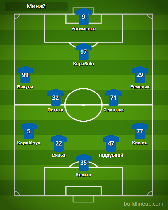 «Минай»: Кемкин – Корнийчук, Скиба, Пиддубный, Кисель (Дмитрук, 66) – Вакула, Петько, Кораблин (Матюшенко, 46), Семотюк (Демиденко, 79), Ременяк (Витенчук, 46) – Устименко (Тищук, 90).