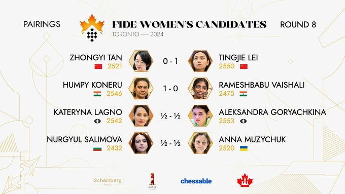В мужском турнире после 8-го тура лидируют двое: Ян Непомнящий (FIDE) и Гукеш Доммараджу (Индия) – по 5 очков из 8.