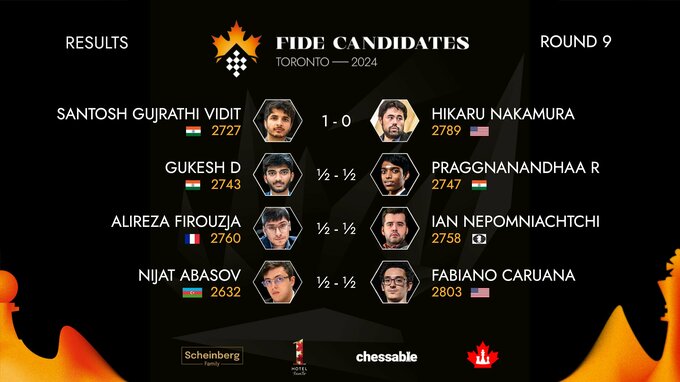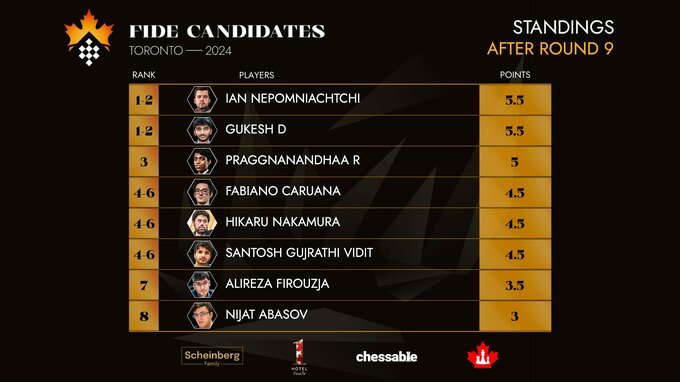 В мужском турнире после 9-го тура лидируют двое: Ян Непомнящий (FIDE) и Гукеш Доммараджу (Индия) – по 5,5 очков из 9.