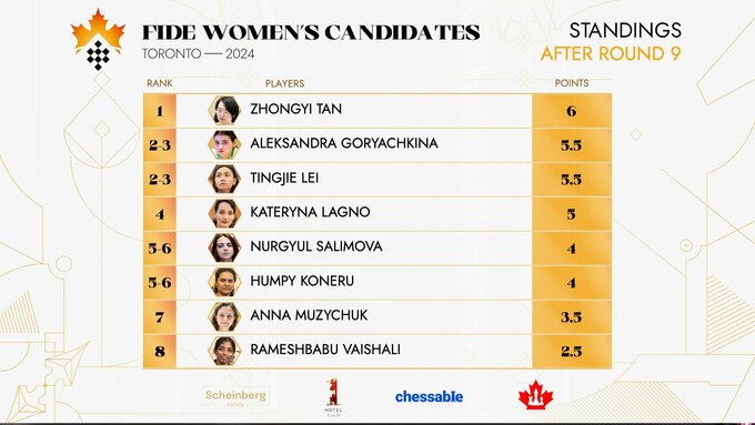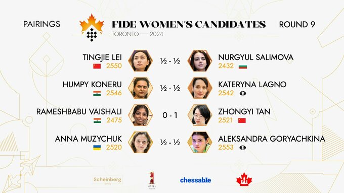 В женском турнире в 9-м туре украинка Анна Музычук белыми фигурами сыграла вничью со спортсменкой-нейтралкой Александрой Горячкиной. Партия длилась 45 ходов.