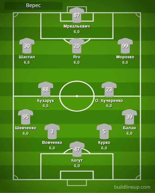 «Верес»: Когут – Шевченко (М. Шестаков, 82), Вовченко, Курко, Балан – Кухарук (Клец, 73), А. Кучеренко – Шастал (Дахновский, 73), Яго, Морозко (Шарай, 65) – Мрвалевич (Гайдучик, 65).