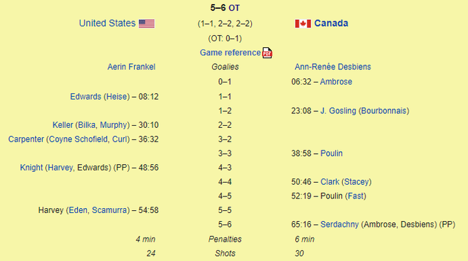 В напряженном финале сборная Канады обыграла команду США со счетом 6:5 OT.