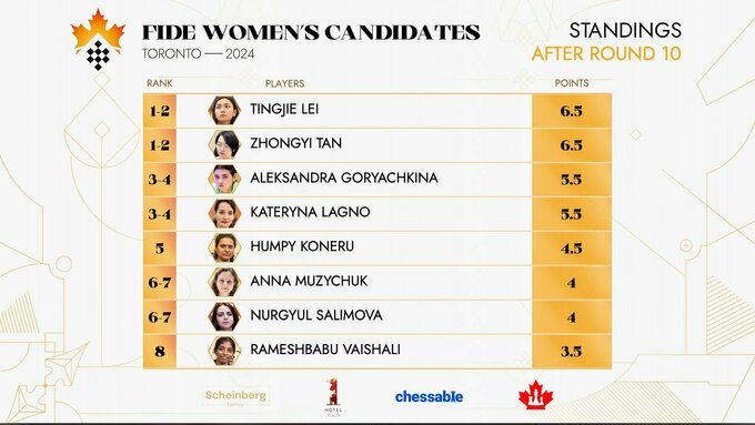 В 10 партиях Музычук 8 раз подписала мирное соглашение и потерпела 2 поражения. Музычук делит 6–7 места (4 очка из 10). Лидируют две китайских шахматистки: Лэй Тинцзе и Тань Чжунъи – по 6,5 очков из 10.