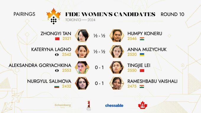 В женском турнире в 10-м туре украинка Анна Музычук черными фигурами сыграла вничью с Екатериной Лагно, бывшей украинкой, которая сейчас представляет страну 404 без гимна и флага. Партия длилась 60 ходов.