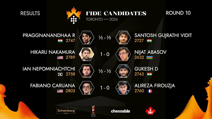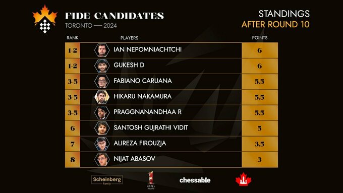 В мужском турнире после 10-го тура впереди Ян Непомнящий (FIDE) и Гукеш Доммараджу (Индия) – по 6 очков из 10.