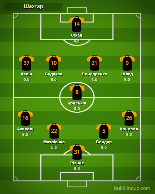 «Шахтер»: Ризнык – Азаров (Траоре, 76), Матвиенко, Бондарь, Конопля (Гочолеишвили, 89) – Крыськив (Марлон, 84) – Кевин (Невертон, 84), Судаков, Бондаренко, Швед (Эгиналду, 84) – Сикан.