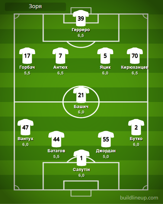 «Заря»: Сапутин – Вантух, Батагов, Джордан, Бутко – Башич – Горбач (Дрышлюк, 52), Антюх (Ндур, 89), Яцик, Кирюханцев (Бугай, 88) – Герреро.