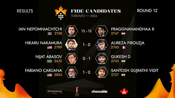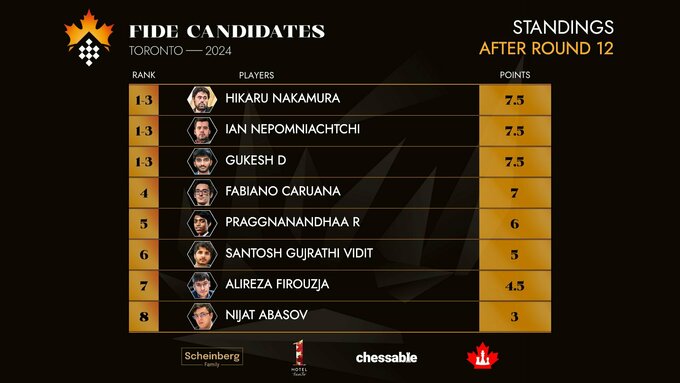 В мужском турнире после 12-го тура образовалось троевластие: Хикару Накамура (США), Ян Непомнящий (FIDE) и Гукеш Доммараджу (Индия) набрали по 7,5 очков из 12. Американец Фабиано Каруана имеет 7 баллов.