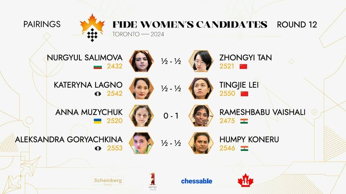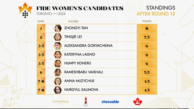 Противостояние китайских шахматисток продолжается: Тань Чжунъи имеет 8 очков из 12, а Лэй Тинцзе набрала 7,5 баллов. Именно они разыграют путевку в матч за титул ЧМ против еще одной китаянки Цзюй Вэньцзюнь.