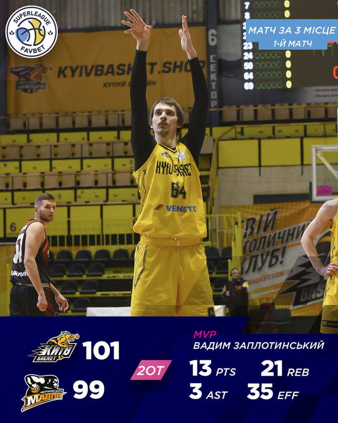 В нем на последних секундах победу одержал Киев-Баскет. Вадим Заплотинский после прохода Льва Кошеватского совершил свой 21-й подбор в матче и добавил мяч в корзину – 101:99 в пользу столичного клуба, что позволило киевлянам повести в серии (1:0).