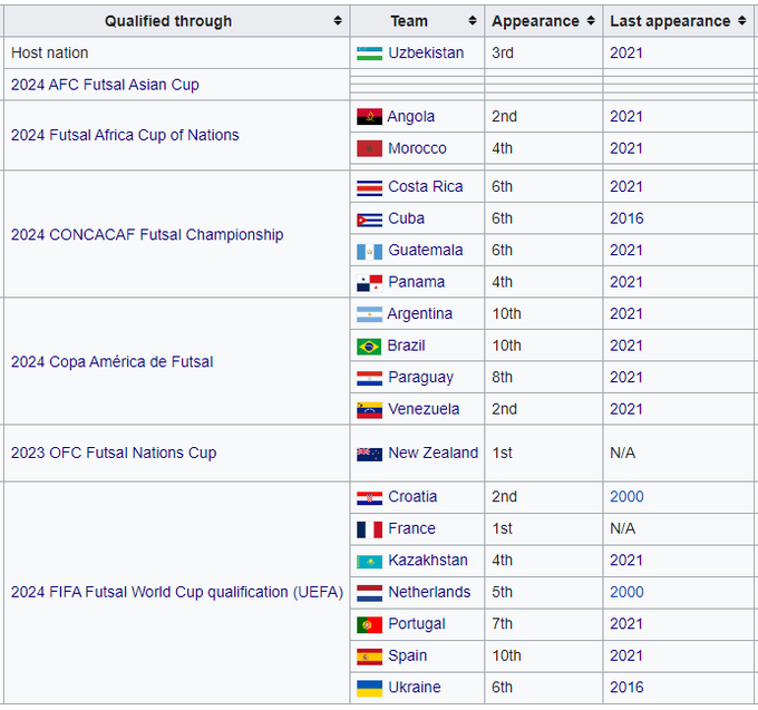Стали известны еще шесть участников финального турнира чемпионата мира по футзалу 2024, который в период с 14 сентября по 6 октября состоится в Узбекистане.