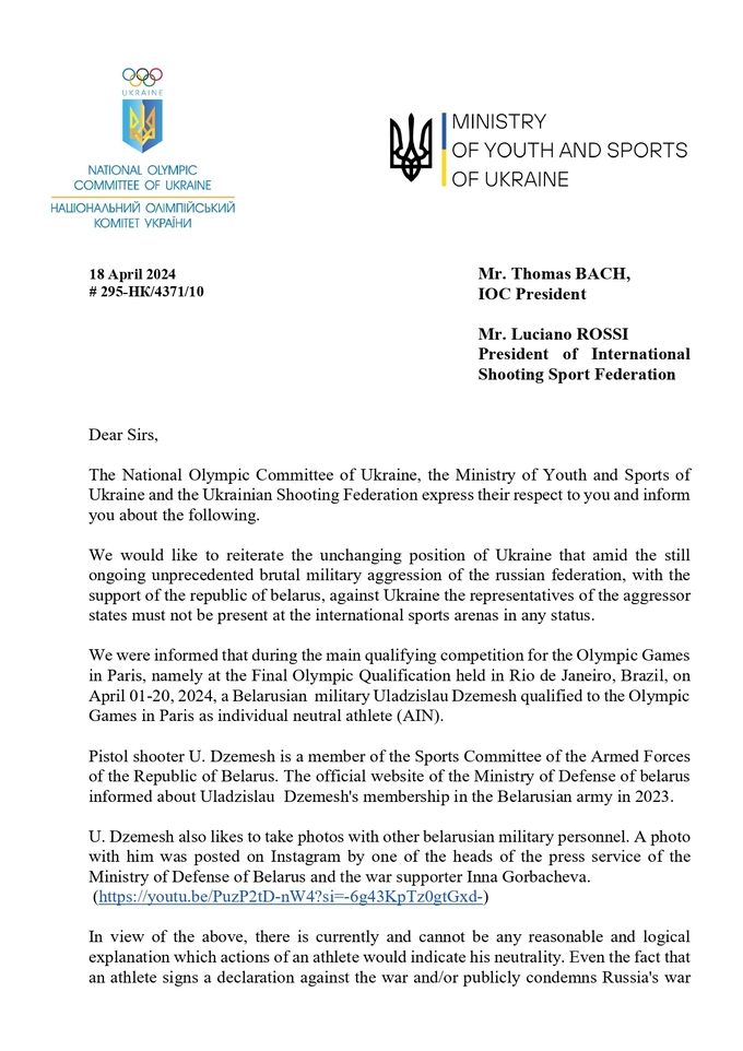Национальный олимпийский комитет Украины вместе с Министерством молодежи и спорта Украины и Федерацией стрельбы Украины требует не допустить белорусского спортсмена-военнослужащего к участию в Олимпийских играх в Париже.