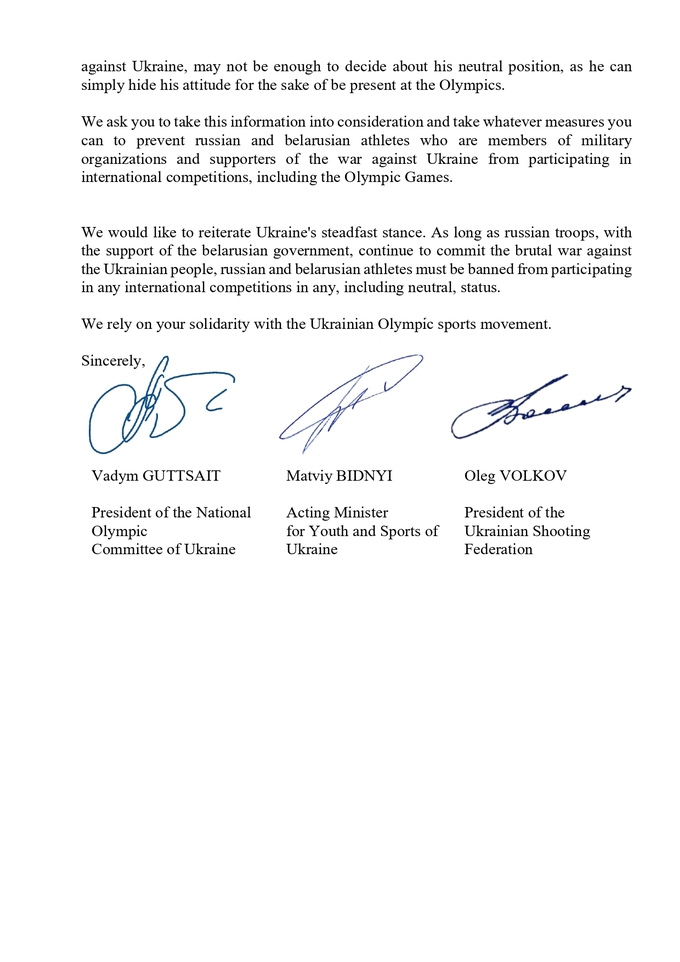 Соответствующее письмо МОК и Международной федерации спортивной стрельбы подписали президент НОК Украины Вадим Гутцайт, и.о. Министра молодежи и спорта Матвей Бидный и президент Федерации стрельбы Олег Волков.