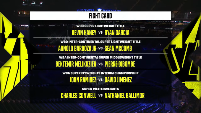 В главном 12-раундовом поединке сойдутся Девин Хэйни из США (31–0, 15 KO) и Райан Гарсия из США (24–1, 20 KO).