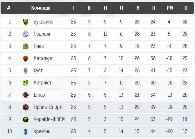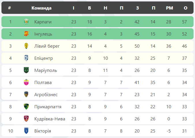 Лидеры Первой лиги: Карпаты (57), Ингулец (52), Левий берег (46), Эпицентр (37).