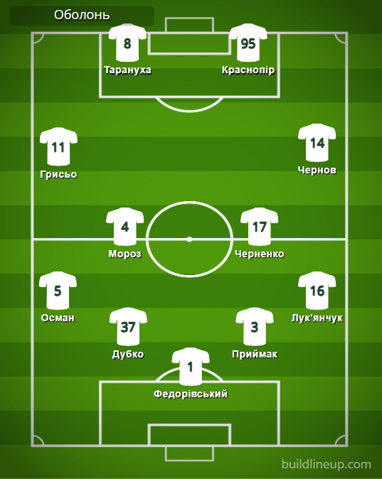 «Оболонь»: Федоровский – Осман (Мединский, 67), Дубко, Приймак, Лукьянчук – Грисьо (Суханов, 61), Мороз, Черненко (Косовский, 76), Чернов (Прокопенко, 67) – Тарануха (Вишневский, 76), Краснопир.