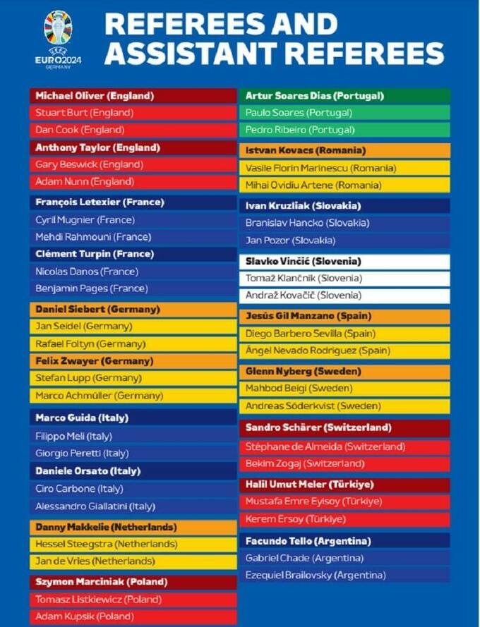 УЕФА объявил список арбитров, которые будут работать на чемпионате Европы в Германии. Всего на Евро будут работать 18 главных судей (+ один арбитр из Южной Америки), а также их полные команды и рефери VAR.