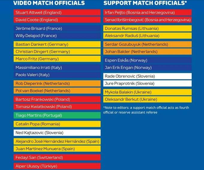 В списке нашлось место украинцам Николаю Балакину и Александру Беркуту – они обозначены в качестве четвертых или резервных судей на матчи Евро.