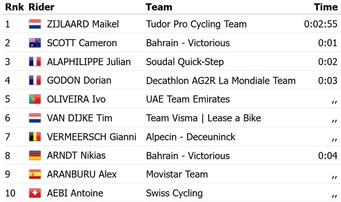 Нидерландец опередил австралийца Кэмерона Скотта из «Bahrain Victorious» и 2-кратного чемпиона мира, француза Жулиана Алафилиппа из «Soudal Quick Step».