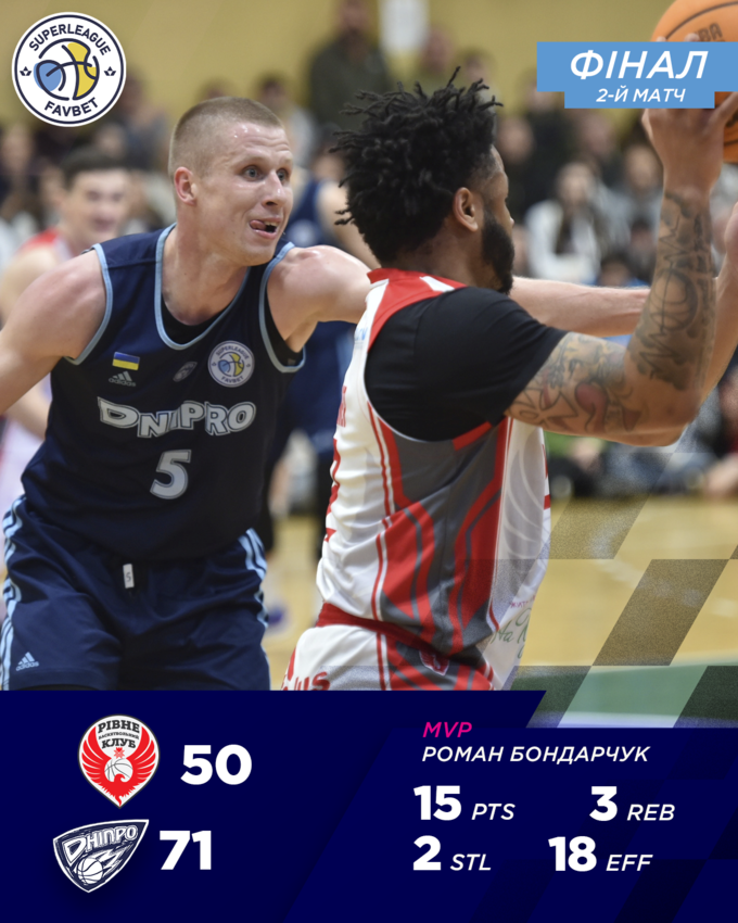 Днепр одержал уверенную победу во втором матче финальной серии баскетбольной Суперлиги, одолев в выездном матче БК Ровно со счетом 71:50.