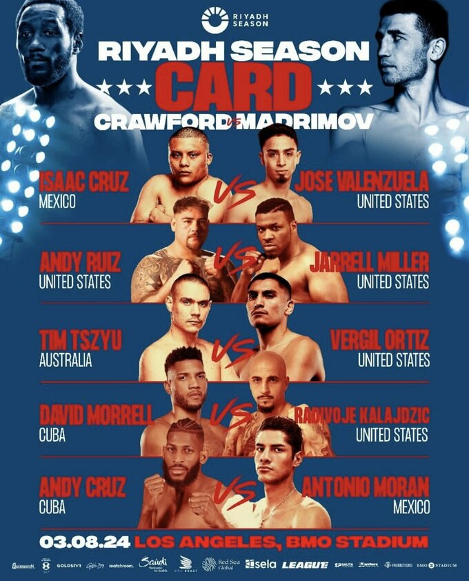Кард вечера возглавит поединок за чемпионский пояс WBO в первом среднем весе между Исраилом Мадримовым и Теренсом Кроуфордом.