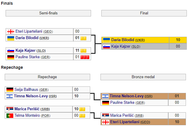 23-летняя украинка последовательно одолела пятерых соперниц: в первых раундах – Пихлу Салонен из Финляндии, Ацелию Топрак из Азербайджана. В четвертьфинале Билодид победила Тимну Нельсон-Леви из Израиля, а в полуфинале – Этери Липерталиани из Грузии.